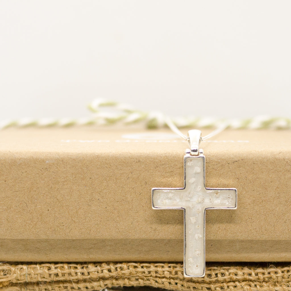 This necklace features a sterling silver cross shaped pendant. The middle contains the ashes of your loved one. The pendant is approximately 20mm in width and length 29mm. the width of the inner cross is 5mm. The chain is an 18 inch sterling silver diamond cut curb chain. It has a 0.9mm width which makes it beautifully delicate, perfect for such a precious pendant.