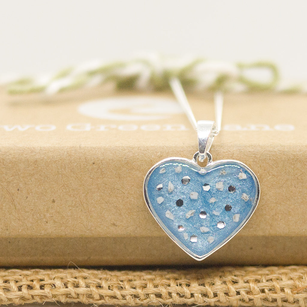 This necklace features a sterling silver heart shaped pendant. The middle contains the ashes of your loved one. The pendant is approximately 15 x 13mm in size. The chain is an 18 inch sterling silver diamond cut curb chain. It has a 0.9mm width which makes it beautifully delicate, perfect for such a precious pendant.